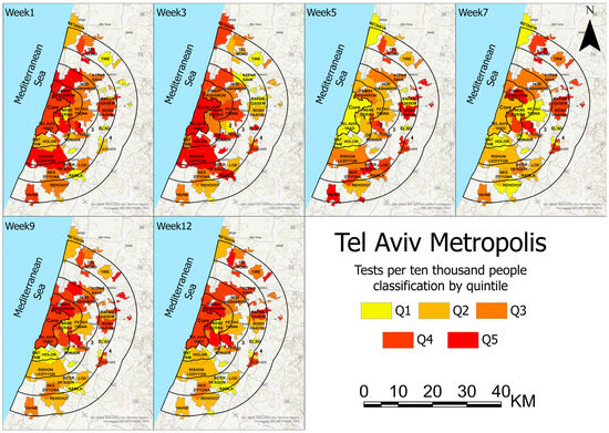 Unlike the PPI, the propagation of COVID-19 tests behaves differently. The social structure in both metropolitan regions is not unified; high-class socioeconomic groups reside in the center, and the farther away a settlement is from the core of the metropolitan area, the lower its socioeconomic ranking. Considering that low-class communities tend to be tested less than their proportion in the entire population [30,31,32,33], one would expect that the number of COVID-19 tests would remain high at the geographic center and low at the peripheral rings along the entire Omicron wave. However, the examination of the low-class socioeconomic group (which populates the metropolitan periphery) reveals that this group is indeed being tested, with a small rate at the beginning of the wave, but gradually the ratio of tests rises until reaching a peak towards the middle of the wave (weeks 5–7). Then, the ratio of testing decreases back as the wave is progressing to its end. In the high-class socioeconomic group (which populates the metropolitans center), the trend is polarized; it starts with high values, then drops towards mid-wave and rises back again as the wave ends (Figure 3). The conjunction of spatial and social perspectives in terms of COVID-19 tests implies that its propagation might also be influenced by social factors. This insight is stronger in the Haifa metropolitan region than in the Tel Aviv-Jaffa region and forms a pattern of contagious diffusion in which the phenomena of high COVID-19 testing diffuses between neighboring spatial rings (from the core to periphery and back). Social factors can be explained by commuting habits between the center and peripheral regions [53], as demonstrated by the cases of 20th-century pandemics such as cholera [54], Spanish flu [55] and AIDS [56] or different public responses to the viral spread fostered and echoed by the media [25,57]. Either way, the number of COVID-19 tests seems to be a false indicator for the actual virus spread.