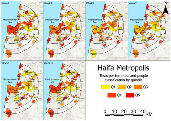 Because the COVID-19 test distribution behaves differently than that of the PPI, a spatial qualitative examination of the tests was carried out. Figure 4 and Figure 5 present the COVID-19 test distribution (normalized per 10,000) over the entire period for the Tel Aviv-Jaffa and Haifa metropolitan regions, respectively. Notably, there are shifts from the center to the periphery and back along the 12 weeks of the Omicron wave. In Tel Aviv-Jaffa metropolitan (Figure 4), starting at week 1, the core and ring 1 present a high ratio of normalized COVID-19 tests (quintiles Q4–Q5 of the distribution), while the peripheral rings (3–4) are attributed with lower ratios. In week 5, the trend alternates, as Tel Aviv-Jaffa and its immediate vicinity demonstrate lower ratios, while the peripheral settlements (e.g., Yavne, Kfar Sava and Rosh Ha-‘Ain) are attributed with higher ratios. In week 9, the trend alternates again, and higher ratios of normalized tests shift back from the peripheral regions to the metropolitan center. At the end of this wave (week 12), the reversed diffusion is complete, as the central region is attributed with high ratios of normalized tests, similar to the values that prevailed at the beginning of the wave (week 1). A similar phenomenon can be seen in the Haifa metropolitan region (Figure 5). In week 1, the core and ring 1 (henceforth “the center”) peak, while rings 2–4 (henceforth “the periphery”) have lower rates, although a few settlements (e.g., Zikhron Yaakov and Nahariya) do demonstrate higher ratios. As the wave progresses, the trend gradually changes, reversing almost completely in week 5: apart from a few exceptions (e.g., Zikhron Yaa’kov, Yoqnea’m, Naharia), the peak diffuses into rings 2–4, while the center is left with lower values. Week 9 marks the transition of the diffusion back from the peripheral rings to the core and ring 1, as the ratio in the center gradually increases from this week (week 9) onward, reaching in weeks 11–12 the values of week 1.