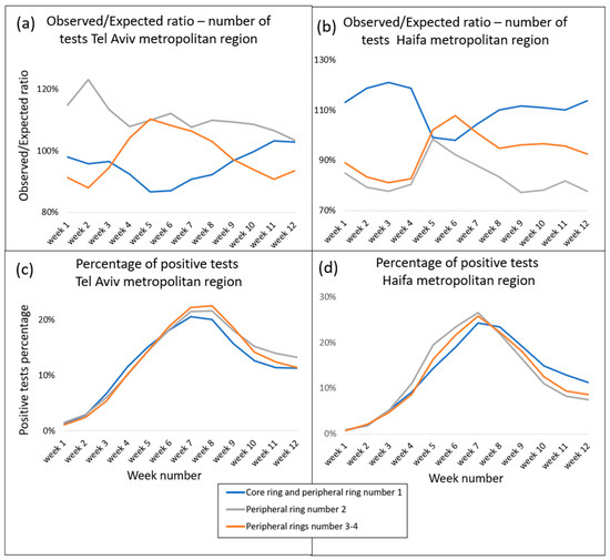Figure 6a,b present the distribution of COVID-19 tests classified into three ring groups (core and ring 1; ring 2; and rings 3–4) for the Tel Aviv-Jaffa and Haifa metropolitan regions, respectively. Accordingly, the ratio between the observed and expected COVID-19 tests at the center (blue line) of these metropolitan regions starts with high values, then decreases and rises back again toward the end of the wave. On the other hand, the ratio in the periphery (orange line) is polarized. It begins with low values at the beginning of the wave, peaks in the middle and then decreases back again toward the end of the wave. This trend is similar to the one described in Figure 3a,b, supporting the fact that that the high-class socioeconomic group is concentrated in the core of the metropolitan regions and the low-class one in the periphery.