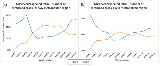 The ratio between the observed and expected values in the core and peripheral ring 4 during the 12 weeks of the Omicron wave. (a) Confirmed cases in Tel Aviv-Jaffa metropolitan; (b) confirmed cases in Haifa metropolitan. Both the Tel Aviv-Jaffa and Haifa metropolitan regions demonstrate higher values of observed confirmed cases than expected (proportional to the population) in the core at the beginning of the wave, while the opposite holds true in peripheral ring 4. Towards the mid period of the wave, the trend alternates, while at the end of the wave it alternates back.
