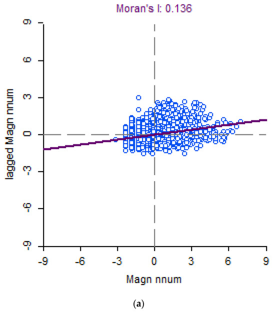 Finally, we proceeded with a research analysis of any spatial autocorrelation. Spatial autocorrelation is a measure that evaluates the degree of similarity between values of a variable at spatially close points [29]. In other words, it measures how similar the values of a variable observed in one location are to those observed in nearby locations. Spatial autocorrelation is critical for understanding spatial patterns in geographic data and for validating spatial models. One of the most common methods for measuring spatial autocorrelation is the Moran index [30].