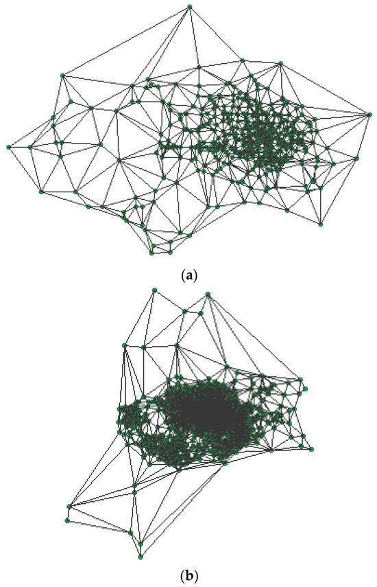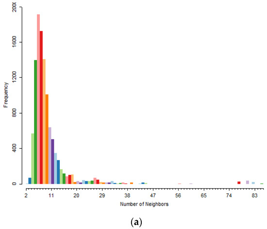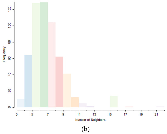 This scenario is visible in the comparison between the clustering histograms (Figure 8a,b), in the comparison between the connectivity graphs (Figure 9a,b), and finally, in the comparison between the cartographic representations of the LISA method (Figure 10a,b).