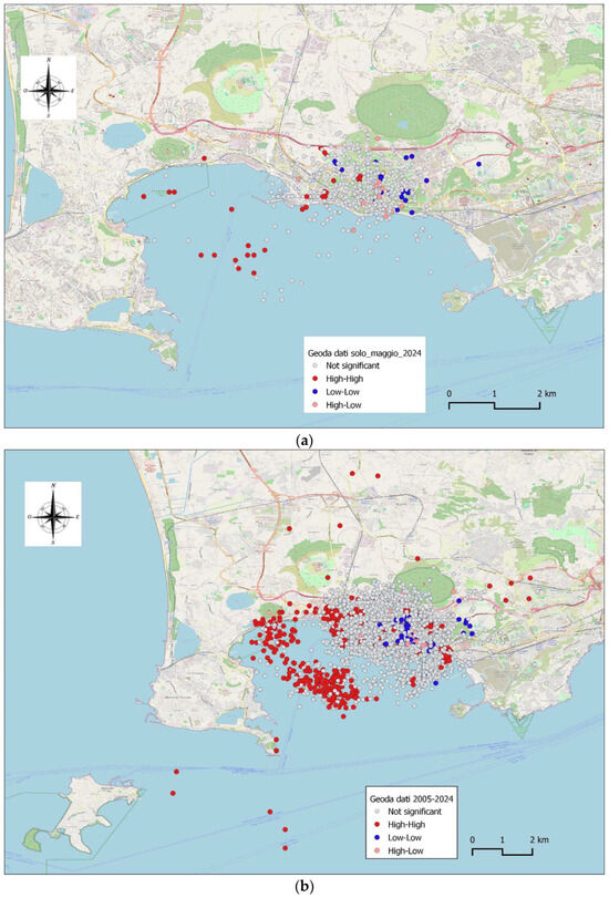 Similarly, the LISA method highlighted a strong clustering in both data sets, characterized only by homogeneous conditions of the high–high or low–low type and not by crossed conditions of the high–low type or the opposite type. In particular, the data of the month of May 2024 clearly identified some restricted geographical areas of the high–high type that require monitoring and attention from the relevant bodies and can be considered as additional data in the ongoing analyses of the domain related to other disciplines.