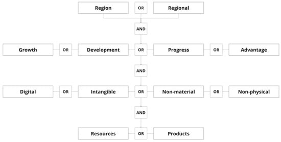 Then, keywords regarding region theory and special interest in digital intangible resources and products were selected; these keywords were turned into search terms using Boolean operators: “region” OR “regional” AND “growth” OR “development” OR “progress” OR “advantage” AND “digital” OR “intangible” OR “non-material” OR “non-physical” AND “resources” OR “products” (see Figure 1).