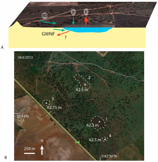 (A) Hydrogeological model proposed for these wetlands. Red arrows: groundwater recharge. Blue arrows: groundwater discharge. (B) Picture showing the flooded area of wetlands in ALG-POTH area and altitude of their deepest points (location in Figure 1C). GWNF stands for ground water net flux. © Google Earth images.
