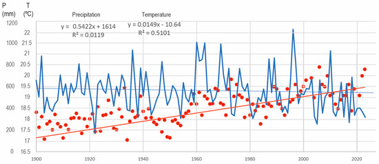 Annual average temperatures (red colour) and annual precipitation (blue colour) in Seville from 1900 to 2024.