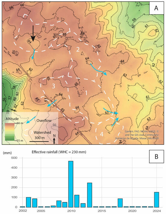 (A) Accurate LiDAR of the ALG-POTH area showing the watershed areas. Blue arrows show overflows to the drainage network. Black arrows show a closed watershed without flooded area. Dashed white line means endorheic watershed (B) yearly effective rainfall calculation from 2002 to 2024.