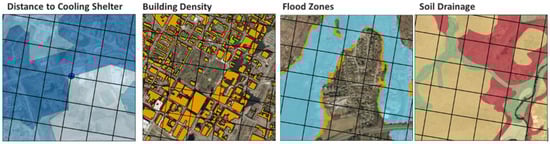 The process starts with generating a standardized spatial grid (with 200 × 200 m grid cells), which serves as the foundation for joining and analyzing all contributing datasets. This source grid excluded cells primarily covered by water, defined as over 70% water coverage for heat analysis and 85% for flood analysis, using the USGS National Hydrography Dataset. Before beginning the data analysis stage, data management and organization are done by collecting all the “Contributing Layers” (raw GIS data, i.e., Building Footprint) and preparing geodatabases to store both the contributing layers and the indicator grids. Each dataset used as an indicator was prepared for analysis by formatting key fields, removing extraneous attributes, and creating placeholder fields for rank scores. These datasets were spatially joined (based on overlapping spatial relationships) to the source grid using appropriate statistical methods (e.g., average, maximum) to assign representative values to each grid cell. The outcome of this joint was a “Contributor Grid,” which contained both raw values and rank scores for each variable (Figure 2).