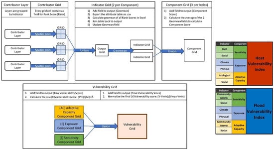 The CCVI integrates diverse datasets into a consistent, interpretable vulnerability score. The index was constructed using a multi-step geospatial analysis. The index was designed to combine exposure, sensitivity, and adaptive capacity scores by assigning rankings to dozens of geospatial layers in ArcGIS Pro. These layers were systematically organized within ArcGIS Enterprise geodatabases to mirror the methodological sequence of data processing steps, as outlined in Table 1.