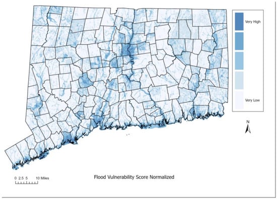 Statewide view of normalized flood vulnerability scores, displayed with a five-class natural breaks classification system. The range of normalized scores is 0–1, with breaks at the following points: 0.06839; 0.121893; 0.203854; 0.346801.