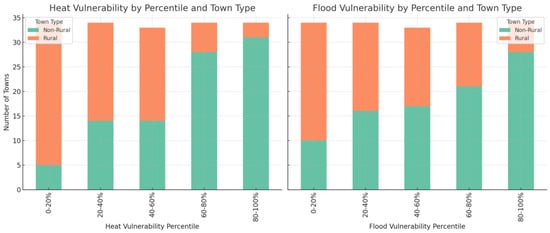 Analysis of town-level data in Connecticut reveals a relationship between rural and non-rural towns, and vulnerability to flooding and extreme heat. In Figure 6, in the case of heat vulnerability (left panel), a trend emerges with towns with higher heat vulnerability percentiles more likely to be non-rural. In the lowest vulnerability bracket (0–20%), the majority of towns are rural, while in the highest vulnerability bracket (80–100%), the majority of towns are non-rural. This suggests that non-rural areas in Connecticut face a disproportionately higher burden of heat-related vulnerability compared to rural areas, which is consistent with expectations since rural towns tend to have indicator values associated with lower vulnerability, such as higher tree cover and lower impervious surfaces. For flood vulnerability (right panel in Figure 6), a similar but less pronounced trend is observed. While rural towns are more prevalent in the lower percentiles (0–40%), non-rural towns become more dominant as vulnerability increases, especially in the 60–100% range. However, the distribution remains more mixed than with heat vulnerability, indicating that both rural and non-rural towns are significantly affected by flood vulnerability, though higher vulnerability still skews toward non-rural areas.