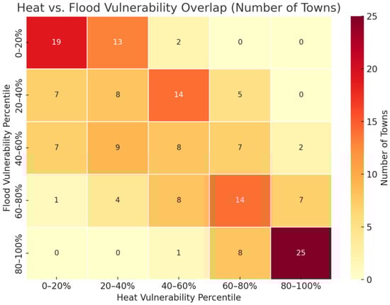 Number of towns that have an overlapping mean heat and flood vulnerability percentile.