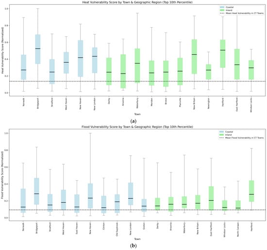 Boxplots showing the distribution of (a) heat vulnerability and (b) flood vulnerability scores (normalized) across towns in the top 10th percentile of each vulnerability index in Connecticut. Towns are color-coded by geographic region (blue = coastal; green = inland) and sorted by descending median score. The dashed horizontal line represents the statewide mean vulnerability score of all towns. The box portion represents the 68th percentile of the interquartile range. The top and bottom of the lines in each town represent the maximum and minimum index values observed in that town.