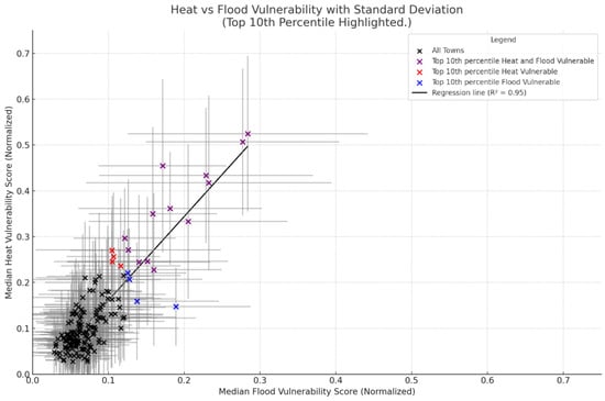 Figure 9 displays the median heat and vulnerability scores for all 169 Connecticut municipalities with standard deviation crossbars. The standard deviation represents the distribution of the index within the town boundary. Of the 90th percentile, 12 towns (7.1%) were classified as being highly vulnerable to both heat and flooding (purple symbols), indicating that they have a compound climate vulnerability. These towns include Bridgeport, Hartford, New London, New Haven, East Hartford, West Haven, New Britain, Norwalk, Waterbury, Stratford, Windsor Locks, Ansonia, and Derby. These municipalities not only face structural exposure (e.g., impervious surfaces, poor drainage, or aging infrastructure) but also tend to have high social sensitivity indicators, such as income vulnerability, elderly populations, and limited access to cooling or evacuation resources. An additional 4 towns (2.0%) in the top 10th percentile, including Plainville, Newington, Meriden, and Bristol, were identified as highly vulnerable to heat, shown in red. These towns demonstrate elevated urban heat island effects, limited greenspace, and in some cases, insufficient social adaptive capacity, contributing to their top 10% heat vulnerability classification. Another 5 towns (3.0%) are in the top 10th percentile, including Old Saybrook and Groton. East Haven, Clinton and North Canaan were highly vulnerable to flooding, represented by light blue. These towns are around the major floodplains. The remaining 148 towns out of the 169 total towns in CT, 87.5%, did not meet the 90th percentile threshold for either heat or flood vulnerability and are categorized as lower relative risk. This distribution highlights the relatively small number of towns facing the highest levels of vulnerability, with a particularly urgent focus needed on the 12 towns experiencing dual exposure. The coefficient of determination (R2) for the regression line fitted to the scatter plot of the median flood and heat normalized vulnerability scores is 0.75. This value suggests a strong positive correlation between the two indices across Connecticut towns, reemphasizing that towns that are more vulnerable to flooding also tend to be more vulnerable to extreme heat. This might be a result of the settlements being made historically along the watershed areas and sharing similar underlying factors in terms of social sensitivity, limited adaptive capacity, and overlapping exposure.