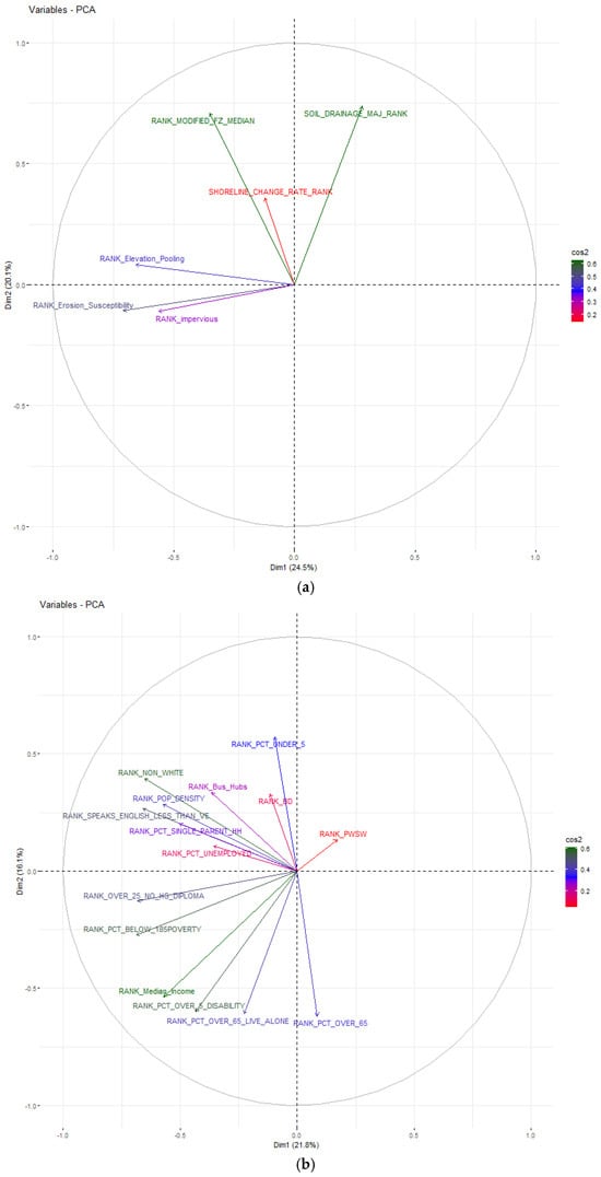 In Flood Exposure (Figure 10a), exposure is mostly defined by geophysical conditions and land-use characteristics. PC2 shares similar themes but emphasizes hydrologic patterns. In Flood Sensitivity, PC1 highlights systemic inequity, while PC2 centers on isolation-based sensitivity, and demographic-related issues. These components are conceptually coherent and reinforce the social dimensions of flood sensitivity. In Flood Adaptive capacity, PC1 captures infrastructure and regulatory preparedness; PC2 leans toward financial capacity. Overall, Flood CCVI shows that PC1 focuses on socioeconomic status, and PC2 captures environmental exposure to flooding and infrastructural readiness.