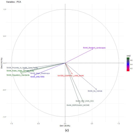 Principal Component Analysis (PCA) variance distribution and its correlation for (a) Flood Exposure, (b) Flood Sensitivity, (c) Flood Adaptive Capacity. The visualization of PCA results in biplots helps users see clustering of similar indicators and their directional contribution to each component. The axes represent the proportion of variance explained by PC1 and PC2, which together capture most of the variability in each dataset. Vectors represent individual indicators, and their orientation and length indicate their influence on each component. Indicators pointing in the same direction are positively correlated, while those at opposing angles are negatively correlated. The cos2 values indicate the contribution of each variable to the principal components—higher values (green) indicate stronger contributions to the selected components, while lower values (red/blue) imply weaker influence.