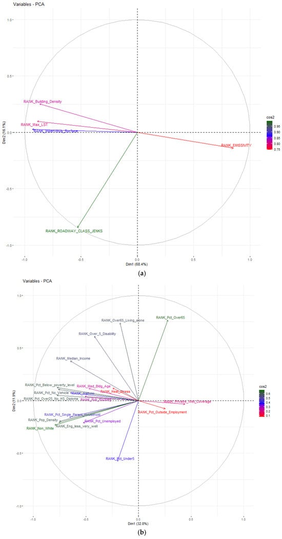 PCA was applied to analyze the internal structure of the Flood and Heat CCVIs, including their subcomponents (Exposure, Sensitivity, and Adaptive Capacity). Table 2, Figure 10 and Figure 11 provide a comparative overview, including the total variance explained for the first three principal components, the dominant indicators in the first three principal components (PC1, and PC2), and the highest cos2 values, indicating which variables are best represented in PCA. Table 2 illustrates how flood and heat vulnerability are composed of a unique combination of indicators. Additionally, Table 2 shows that the dimensional concentration is not only focused on one PC, indicating that the index design captures the distinct and interrelated domains of vulnerabilities.