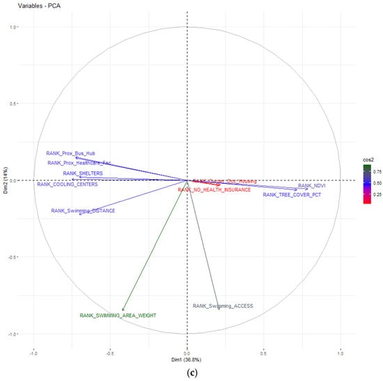 PCA variance distribution and its correlation for (a) Heat Exposure, (b) Heat Sensitivity, (c) Heat Adaptive Capacity. The visualization of PCA results in biplots helps users see clustering of similar indicators and their directional contribution to each component. The axes represent the proportion of variance explained by PC1 and PC2, which together capture most of the variability in each dataset. Vectors represent individual indicators, and their orientation and length indicate their influence on each component. Indicators pointing in the same direction are positively correlated, while those at opposing angles are negatively correlated. The cos2 values indicate the contribution of each variable to the principal components—higher values (green) indicate stronger contributions to the selected components, while lower values (red/blue) imply weaker influence.