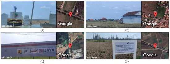 Based on the description above, rice is a staple food in Indonesia that is mainly cultivated on irrigated fields, partly on dry and tidal lands. In 2022, the total area of these fields in Indonesia was 7.46 million ha, with the largest distribution in Java (3.4 million ha), Sumatra (1.9 million ha), and the Sulawesi Islands (0.8 million ha) [9]. However, rice fields in Java have declined sharply due to high population density and economic growth. This region comprised approximately 156.93 million people, constituting over 55% of Indonesia’s population [10], and economic growth of 4.18% was recorded in 2024 [11]. These two factors, alongside others, caused the drastic decline of rice fields in Java, resulting in the conversion to built-up areas. Specific examples associated with the causes of declining agricultural land area in Java include (a) factory construction on former rice fields in the Pengkadan Sub-district, Cirebon (−6.806226°, 108.67718°); (b) rice fields encroached upon by settlements in the Babakan Sub-district, Cirebon (−6.87786°, 108.72523°); (c) toll road development for Patimban Seaport access in the Pamanukan Sub-district, Subang (−6.313074°, 107.82139°), specifically the development project of Patimban International Seaport in Subang Regency, West Java Province, which requires 334 hectares of mainland [12]; and (d) the West Java Petrochemical Complex industry expansion site in the Balongan Sub-district, Indramayu (−6.38996°, 108.38727°), which is owned by Pertamina in Indramayu Regency, West Java Province, and covers 331.92 hectares [13]. Most of the affected agricultural land consists of rice fields and gardens with relatively small average sizes of approximately 0.6 ha per farming household [12]. Figure 1 shows photographs with respective locations plotted on Google Earth, depicting the dynamics of the conversion of rice fields to non-agricultural uses in West Java Province.