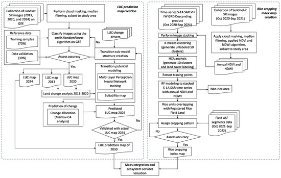 Aside from advances in land use modeling, there is a gap in integrating geospatial methods to develop simulation models. These are aimed at mapping rice fields with their RCI attributes and quantifying ES—particularly food production—using multi-source remote sensing data at a 10 m spatial resolution. The novelty of this study focuses on combining high-resolution (10 m) RCI-based rice field mapping with a customized land use simulation model that explicitly incorporates related dynamics and ES evaluation. The main objective is to formulate a comprehensive model that predicts rice field losses and evaluates the impact of urban expansion on regional food production. This study uses advanced geospatial technologies that enable an accessible, rapid, precise, and cost-effective analysis of agricultural land conversion for urban uses, focusing on Indramayu Regency in West Java Province as a representative case study for Java Island.