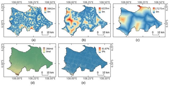 LUC change drivers: distance to settlements (a), distance to water bodies (b), distance to road networks (c), elevation (d), and slope (e).