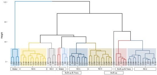 Dendrogram of hierarchical cluster analysis results and land use/land cover labeling, including the rice cropping zone (RZ). Different colors indicate distinct cluster groupings related to the corresponding land use/land cover classes, such as water bodies and built-up areas.