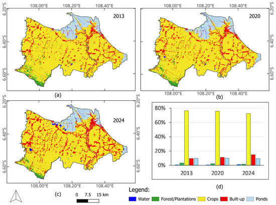 Landsat imagery was classified to generate LUC maps for 2013, 2020, and 2024 using the Random Forest (RF) machine learning algorithm in GEE. The RF algorithm adopted an ensemble of decision trees, using the collective computational power to achieve superior prediction accuracy while reducing overfitting tendencies, including in the satellite imagery classification function [41]. It was selected due to its robustness in handling multispectral data and proven high accuracy in LUC classification [42,43]. In GEE, a majority filter was applied to each RF classification result to reduce noise. Additionally, post-classification refinement was implemented through visual interpretation to improve accuracy and generate the final LUC map. This refinement process was performed in QGIS desktop 3.34.11-Prizren software using the Thematic Raster Editor (ThRasE) plugin version 25.6 (https://plugins.qgis.org/plugins/ThRasE/ and accessed on 9 September 2024). The final LUC map consisted of five categories, namely, (1) rivers/lakes, (2) forests/plantations, (3) cropland, (4) built-up areas (settlements, industries, roads, and other artificial land uses/cover), and (5) ponds.