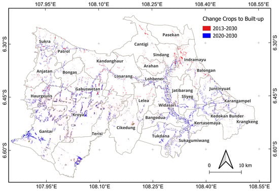 Projections of land use change for the period of 2020–2030 showed an intensifying trend of agricultural land conversion. It was predicted that there would be a significant reduction in agricultural land compared to the previous period, reaching 4740.39 ha (2.27%). However, the built-up area was predicted to experience a significant expansion of 4921.2 ha (2.36%), increasing its proportion from 11.22% to 13.58% of the total area. This finding showed that the process of urbanization and development would continue at a higher rate, with most of the built-up area expansion occurring through the conversion of productive agricultural land. An illustration of cropland conversion to built-up areas during the period of 2013–2020 and its projected continuation from 2020 to 2030 is presented in Figure 8.