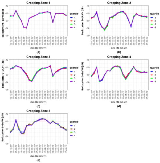 Temporal profile of S–1A VH backscatter in five rice cropping zones in Indramayu Regency (October 2021–September 2022): CZ-1 (a), CZ-2 (b), CZ-3 (c), CZ-4 (d), and CZ-5 (e). Each subfigure shows the backscatter dynamics for quartiles 1–4 in each zone, reflecting similarity in planting schedules and cropping intensity.
