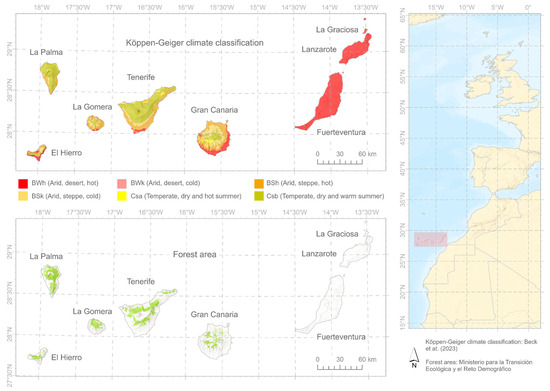 Location, climates, and forest area of the Canary Islands. Sources: [11,12].