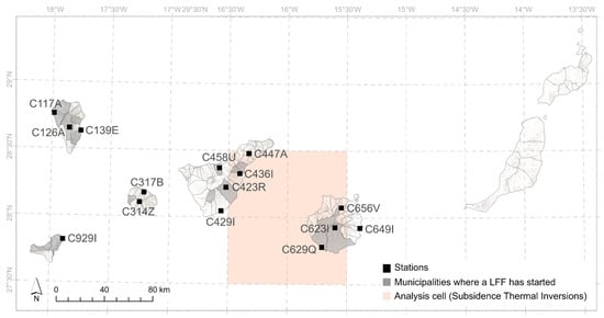 Municipalities where LFFs started in the Canary Islands (1983–2023), location of the reference meteorological observation stations, and the grid cell used for the analysis of the subsidence thermal inversion.