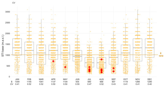 STI base altitude in the Canary Islands (1983–2023). The yellow points represent the daily STI base. In red, STI base during LFF start days. Below each month, the monthly mean and the coefficient of variation (CV) are shown. Note that during the summer months, the base of the STI lowers. Additionally, variability in the STI base is generally reduced in summer, indicating more stable atmospheric conditions during this period.
