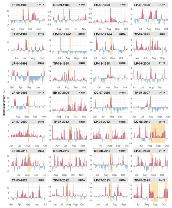 In turn, during the days when LFFs are active, the thermal anomalies are significant, with an average of +3.5 °C. In many cases, fire control coincides with the end of exceptionally warm episodes with respect to usual conditions—TF-09-1983, LP-04-1998, TF-07-2022, among others. Noteworthy are events LP-04-1998 and LP-11-1998, recorded in non-summer months and coinciding with considerable thermal anomalies in the previous weeks—Figure 5.