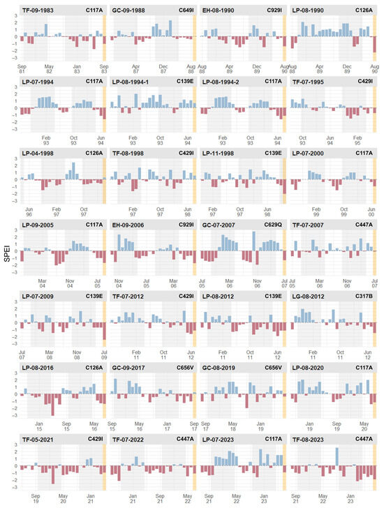 Monthly SPEI during the two years prior to LFFs in the Canary Islands. The rainy season (October–April) is shaded in gray, while the start month of LFFs is shown in orange.