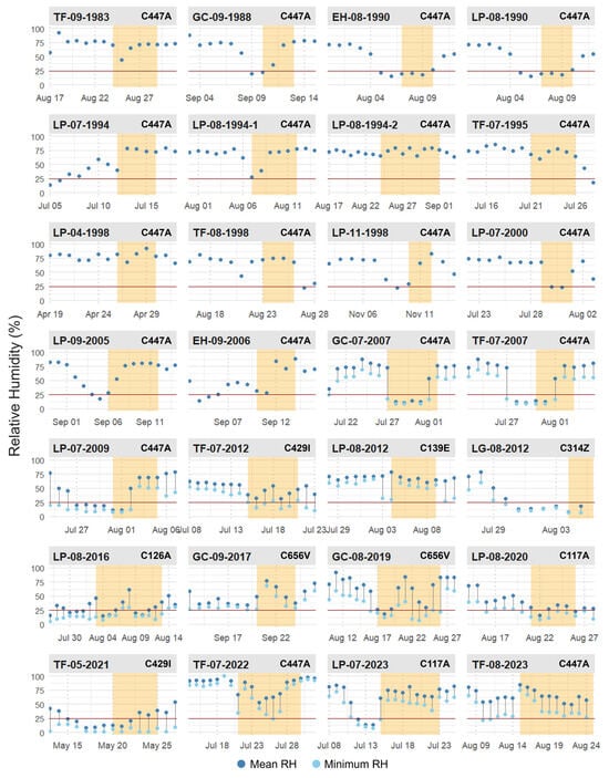 Mean and minimum Relative Humidity before, during, and after LFFs in the Canary Islands. In orange, the period of fire activity.