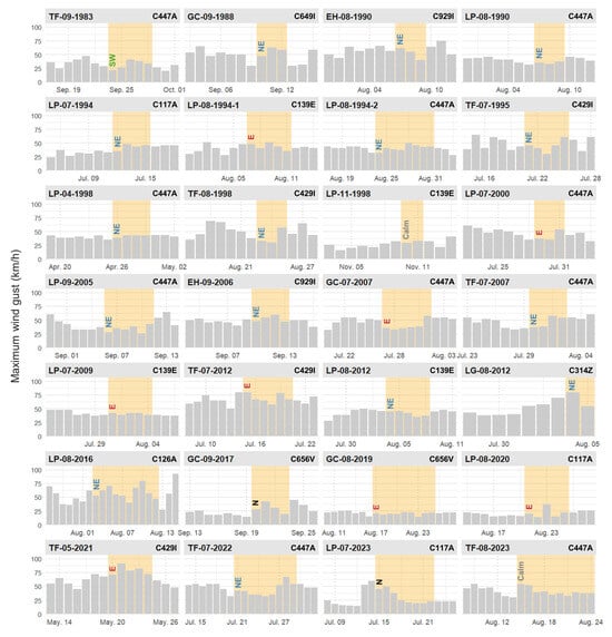 No significant differences are identified with respect to the intensity of the maximum gust recorded during the start day depending on the prevailing direction. Nevertheless, on the first day of three LFF, maximum gusts of over 70 km/h were identified, which, according to the Beaufort scale, can be considered a gale situation. Likewise, in another ten events, as shown in Table A5 in Appendix A, the intensity of the maximum gust is considerable—above 40 km/h—while, on the contrary, in five of them, the highest gust intensity was below 30 km/h. It should be taken into account that the average intensity of the maximum daily gust in the series considered is around 30 km/h. In any case, it is important to keep in mind that the complex orography of the islands can locally increase wind speed and change its direction.