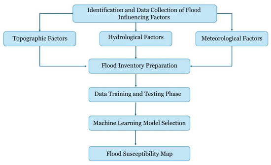 Identification of flood-influencing factors is vital for accurate flood risk forecasting and susceptibility mapping, which is often complicated by the variability in terrain, hydrological behavior, and meteorological conditions [32]. To address this challenge, the present study categorizes the selected factors into three primary groups: topographical, hydrological, and meteorological. Table 1 presents the data used in this study to identify these factors, which were processed following the methodology shown in Figure 2.