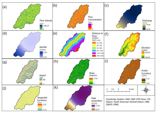 The spatial distribution of key flood-influencing factors, including (a) flow velocity; (b) flow concentration; (c) discharge; (d) rainfall; (e) distance to river; (f) elevation; (g) aspect; (h) slope; (i) profile curvature; (j) tangential curvature; (k) peak streamflow.