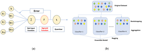 (a) Schematic diagram of the logistic regression model architecture used for flood susceptibility assessment. X1, X2, and Xm represent sets of predictor features; W1, W2, and Wm represent corresponding weights; b represents the bias term; ∑ represents the calculated weighted sum of inputs plus bias; χ represents the probability value; and t assigns this probability to a discrete flood risk category. (b) Schematic diagram of the bagging model architecture used for flood susceptibility assessment.