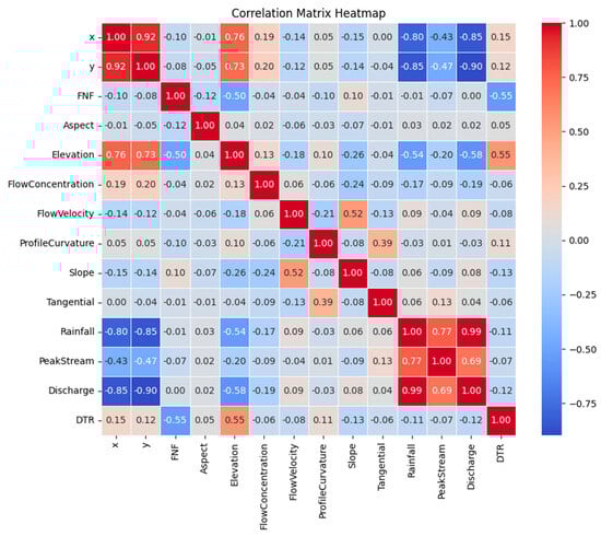 Figure 5 displays the correlation matrix heatmap, which depicts the relationship between flood occurrence (FNF) and several flood conditioning factors. Notably, elevation and distance to river (DTR) show the strongest negative correlations with FNF, at −0.50 and −0.55, respectively, suggesting that flooding is less likely in areas located at higher elevations and farther from riverbanks. The slope variable reveals a moderate negative correlation (−0.24), indicating that steeper slopes promote quicker water runoff and thus reduce flood accumulation. In contrast, rainfall exhibits only a very weak positive correlation (0.03), signifying that rainfall alone is a weak predictor of flooding in this dataset. Additionally, other terrain and flow-related factors—such as flow velocity, curvatures, and flow concentration—demonstrate minimal correlation with FNF, which suggests their direct influence on flood occurrence is limited.