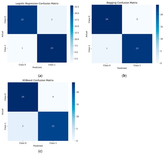 Confusion matrix for (a) logistic regression; (b) bagging classifiers; (c) XGBoost.