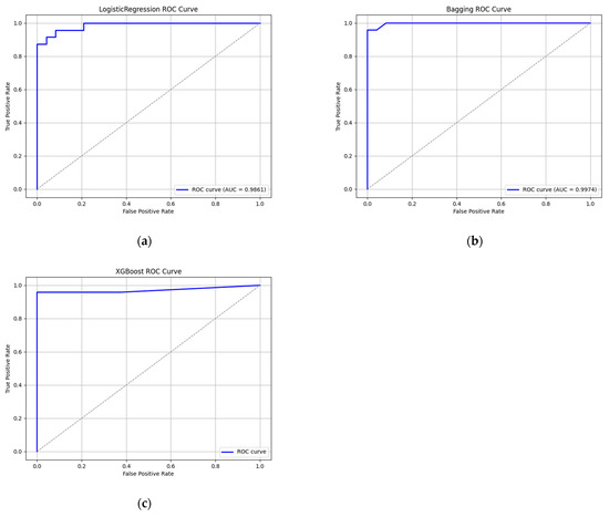 ROC Curve for (a) logistic regression; (b) bagging; (c) XGBoost models.