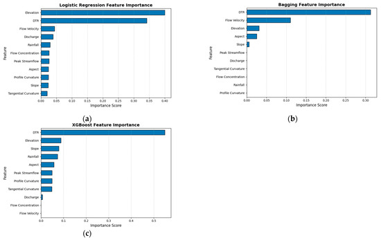 The importance of each flood conditioning factor was assessed for the logistic regression, bagging, and XGBoost models, as shown in Figure 8. This helps to understand how each model evaluates and prioritizes different factors when predicting flood-prone areas.