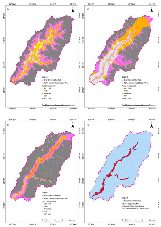 For the Briar Creek watershed, FEMA has designated two flood zones: AE, indicating the Special Flood Hazard Area (SFHA), and X, representing the 0.2% annual chance flood, as illustrated in Figure 9d. Table 6 compares the spatial agreement of the very-high-risk zones identified by the three models with FEMA’s SFHA classification for the Briar Creek watershed.