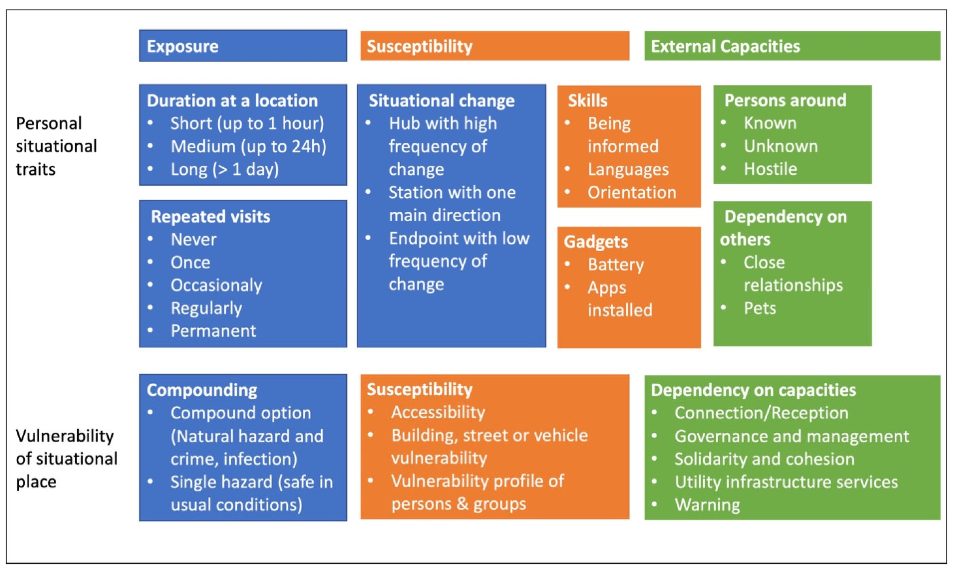 The figure shows that the upper row captures personal situational characteristics. During movements and mobility, temporal aspects need to be incorporated into existing frameworks that currently focus solely on spatial exposure. The duration at a location is a factor that influences exposure; for example, dosages of contamination, being immersed and affected by a flood, avalanche, or earthquake are similar. The respective useful time separations need to be adjusted to each specific hazard. Short-, medium-, and long-duration events can be separated to identify different types of risks for individuals. We consider all the components in this first row of personal situation characteristics, which are not concerning a hazard, but rather being familiar with the environment and situation. When a person enters an unknown location, most of the situation and environment will still be rather unfamiliar in the first moments. When people become stuck in a subway station, for example, or at an airport for several hours, they come to know their environment. It is essential to distinguish this from longer durations, as the situation then transitions into a place-based vulnerability assessment that can be compared to existing static vulnerability assessments, which generalise conditions for longer residencies. The duration at a location is only one factor; another is repeated visits to the same location that can also determine how and whether people familiarise themselves with it. Another addition is the situational change that is also related to the type of environment. For example, some stations, such as bus or train stations, provide orientation if exits and driving directions primarily go in one direction. This can become more confusing for orientation when it is a hub with many floors, or when it is a hub like an airport with a high frequency of people and traffic changes. As an opposite example, with calmer situations, a building or destination could be identified with low frequencies of change.