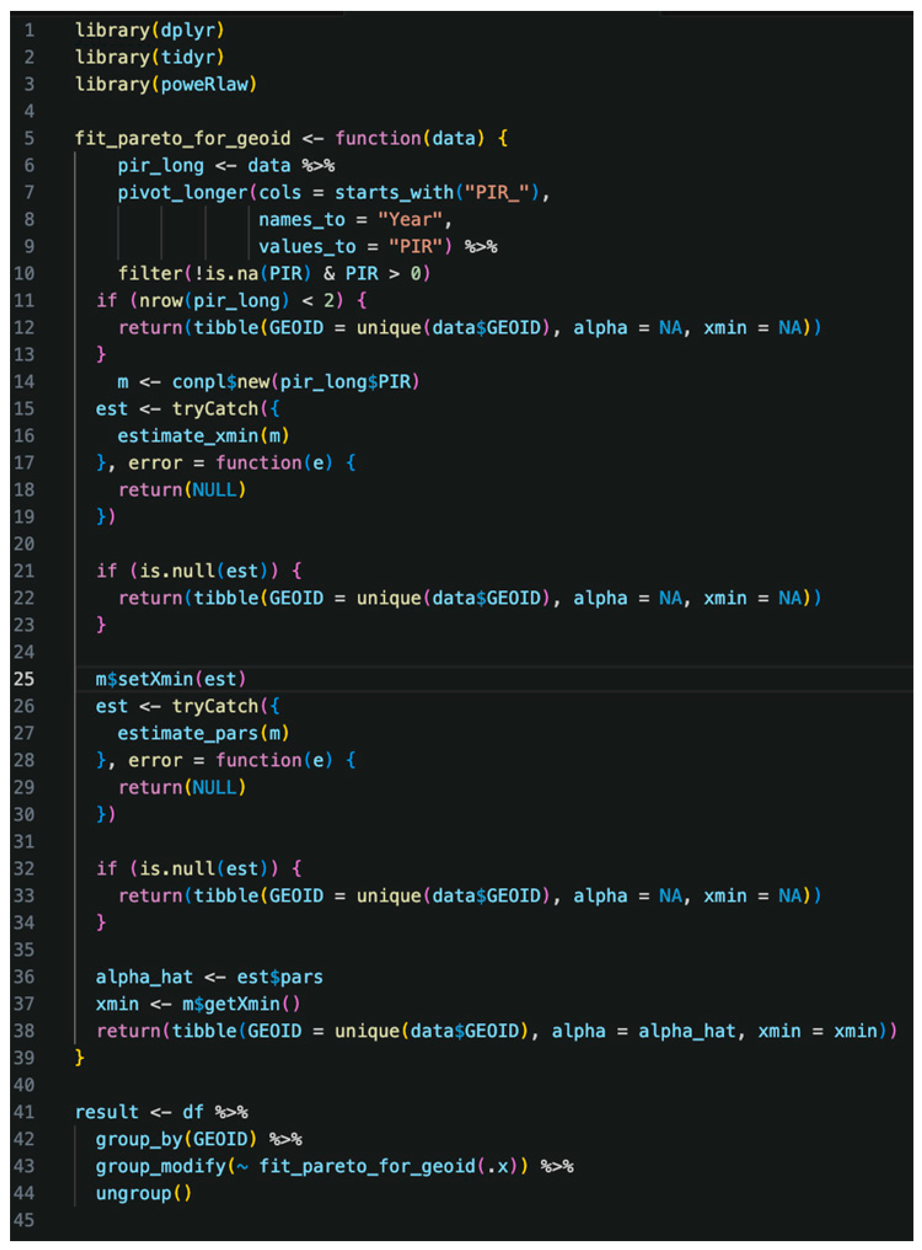 The process was conducted in R, utilizing the poweRlaw package, a standard tool for fitting heavy-tailed distributions. For each county’s PIR data, the parameters of the Pareto distribution were estimated independently. The xmin parameter, representing the threshold above which the power-law behaviour holds, was estimated by minimizing the Kolmogorov–Smirnov (KS) statistic between the data and the fitted model. Subsequently, the shape parameter α was estimated using the maximum likelihood estimation (MLE) method for all data points greater than or equal to the estimated xmin. A formal goodness-of-fit test was not performed as part of this initial analysis, which should be noted as a limitation; however, these estimation methods are standard practice for robustly fitting power-law distributions. After the calculation of the values, the ‘group_by’ and ‘group_modify’ functions were used to apply the ‘fit_pareto_for_geoid’ function to each GEOID, which represents USA counties (Figure 1). GEOID is a standard geographic identifier code used by the U.S. Census Bureau to represent counties. This step ensures that each county’s PIR data is processed independently to fit the Pareto distribution. The estimated parameters α and xmin are interpreted based on their ranges. For α, the following criteria are used: