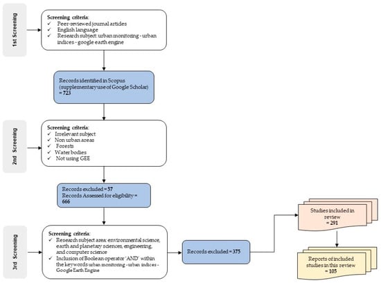 A critical review was conducted in this study on a total of 105 selected manuscripts to examine the applications of GEE for urban monitoring over the last decade. The screening process followed the methodological flow, including peer-reviewed studies that applied GEE to urban contexts using vegetation, thermal, greenness, or density indices. Studies without a clear urban focus or not employing GEE as a primary tool were excluded. The analysis reveals a clear and accelerating trend in the adoption of GEE, with moderate usage in the early years (2015–2017) and a steady increase from 2018 onwards, leading to a substantial surge in publications by 2024. This pattern underscores GEE’s growing prominence as a reliable and accessible platform for large-scale, multi-temporal urban analyses. Its effectiveness in integrating diverse datasets enables advanced analyses of complex urban environments. Several key conclusions from this review can be summarized as follows: