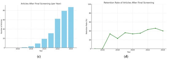 (a) Chart depicting the comparison of the number of articles retrieved from Scopus and those retained after the final screening for the period 2015–2024. (b) Annual distribution of articles across the different screening stages. (c) Number of articles included after the final screening for each year between 2015 and 2024. (d) Retention rate of articles after final screening; (%) of articles retained relative to the number of articles initially found in Scopus, for the years 2015–2024.