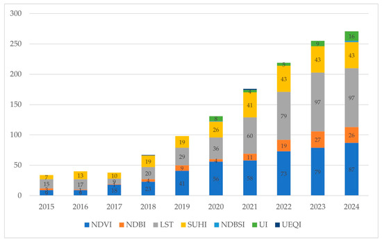 Annual distribution of publications using major satellite-derived indices (NDVI, NDBI, LST, SUHI, NDBSI, UI, UEQI) within Google Earth Engine for urban monitoring applications from 2015 to 2024.