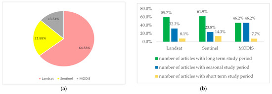 (a) Percentage distribution of studies using different satellite imagery sources (Landsat, Sentinel, and MODIS). (b) Distribution of study periods (long-term, seasonal, and short-term) for each satellite dataset used in the analyzed articles. The percentages in (a,b) represent the proportion of studies using each satellite source rather than mutually exclusive categories, as several studies employed multiple datasets in combination.